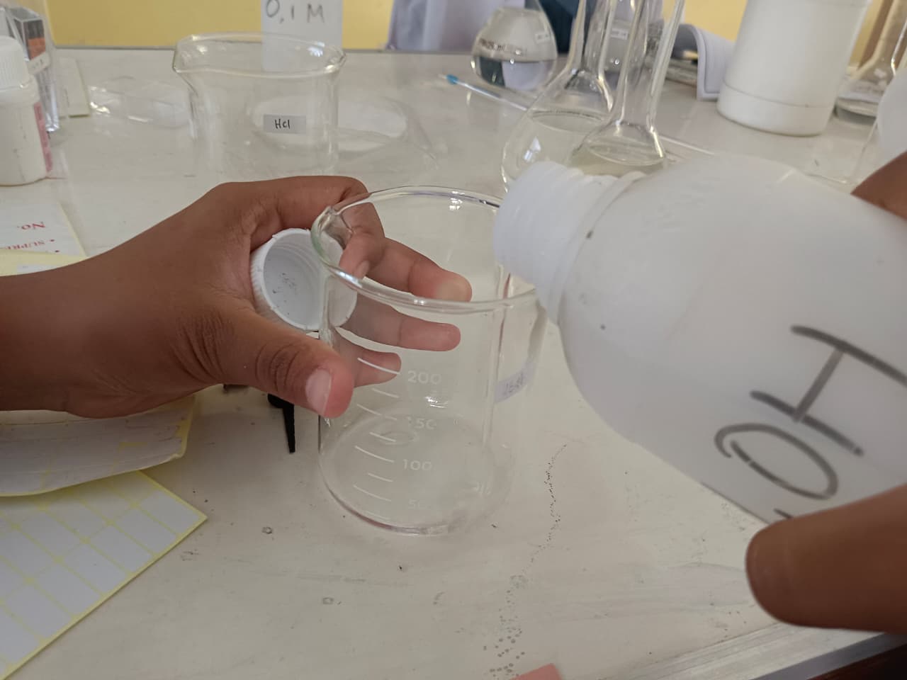 Tuang larutan HCl dan larutan NH₄OH ke dalam gelas beaker